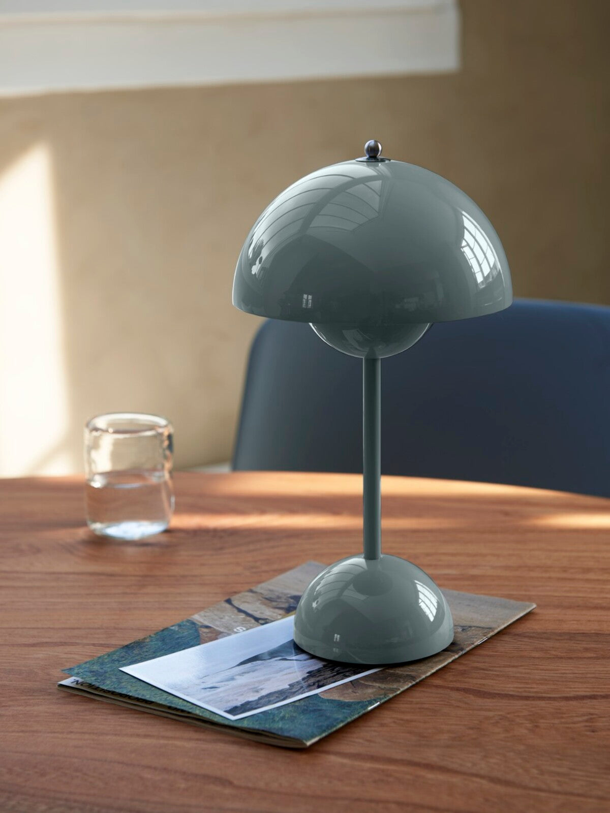 ドーム型のアッパーシェードと、そこからぶら下がっているような丸みを帯びた下側のシェードが作るシルエット、そして鮮やかなカラーが特徴のフラワーポットは、ヴァーナー・パントンが常に新しいデザインを追い求めていた挑戦的な姿勢を体現しています。ポータブルランプであるVP9は、フラワーポットのテーブルランプタイプよりも少し小さく、意図的に軽量に設計され、電源はUSB充電ケーブルを採用しています。多くのカラー・バリエーションからお選び頂くことが可能で、充電いただくことで屋内だけでなく、一定時間屋外でもお使いいただけます。電池、光源の交換はできません。USB対応のACアダプターは付属しておりません。防水対応の照明ではありません。